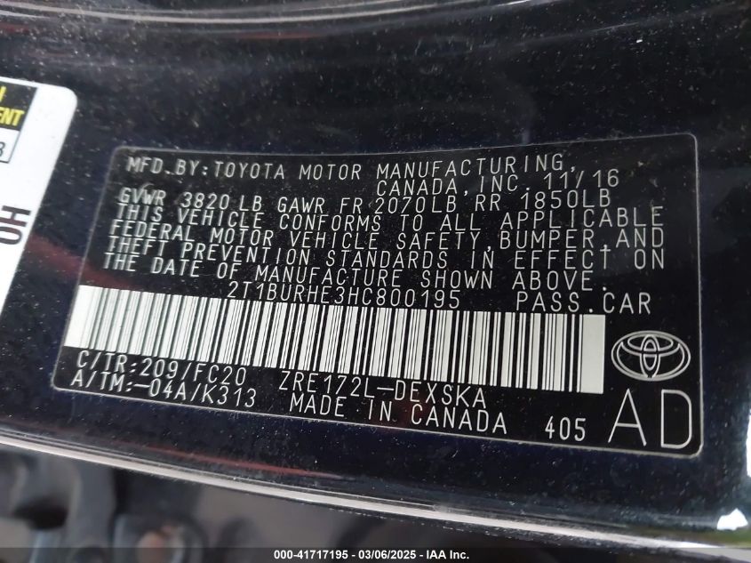 2017 TOYOTA COROLLA 2017 Gasoline, 1.8, Front wheel drive, VIN - 2T1BURHE3HC****** from the USA
