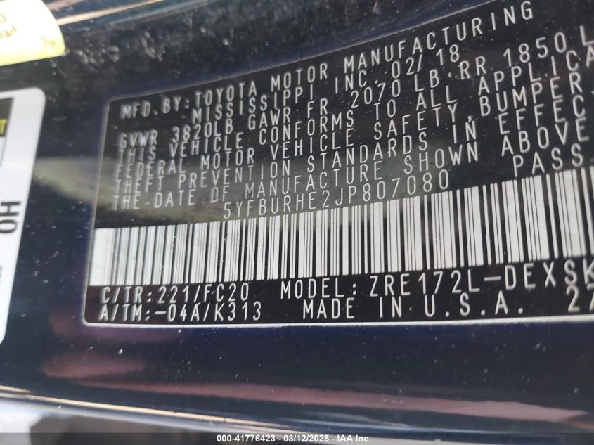 2018 TOYOTA COROLLA 2018 Gasoline, 1.8, Front wheel drive, VIN - 5YFBURHE2JP****** from the USA