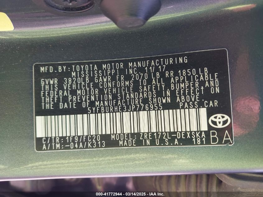 2018 TOYOTA COROLLA 2018 Gasoline, 1.8, Front wheel drive, VIN - 5YFBURHE3JP****** from the USA