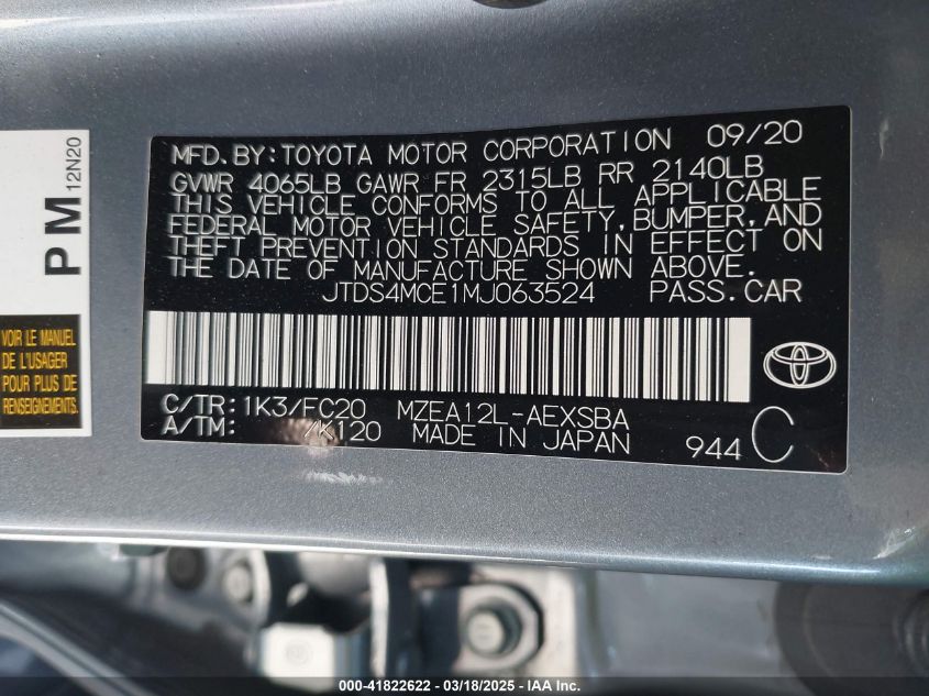 2021 TOYOTA COROLLA 2021 Gasoline, 2.0, Front wheel drive, VIN - JTDS4MCE1MJ****** from the USA