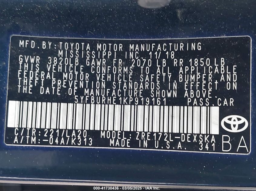 2019 TOYOTA COROLLA 2019 Gasoline, 1.8, Front wheel drive, VIN - 5YFBURHE1KP****** from the USA