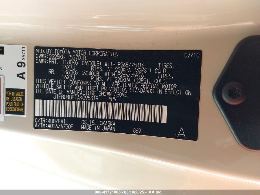 Color CreamyCylinders 6Drive Full driveVIN JTEBU4BF1AK******State Run & Drive VerifiedDamage Front and back AutoRIA