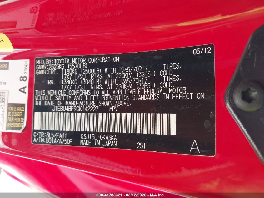 Color RedCylinders 6Drive Full driveVIN JTEBU4BF9CK******State Run & Drive VerifiedDamage Front or back AutoRIA