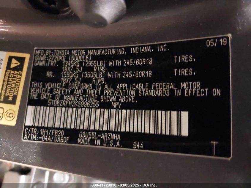 2019 TOYOTA HIGHLANDER 2019 Gasoline, 3.5, Full drive, VIN - 5TDBZRFH2KS****** from the USA