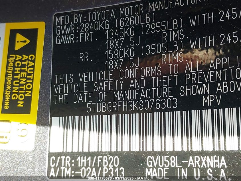 Color GrayCylinders 6Drive Full driveVIN 5TDBGRFH3KS******State Run & Drive VerifiedDamage Front or back AutoRIA