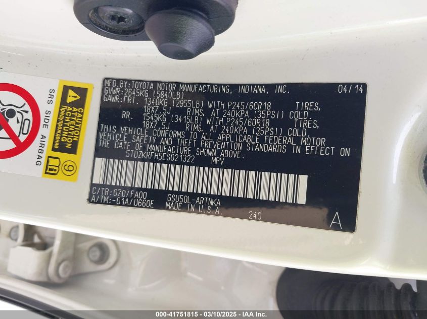 Color WhiteCylinders 6Drive Front wheel driveVIN 5TDZKRFH5ES******State Run & Drive VerifiedDamage Front rightAuction date 2025-03-24 AutoRIA