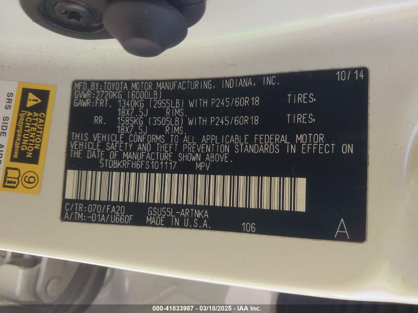 2015 TOYOTA HIGHLANDER 2015 Gasoline, 3.5, Full drive, VIN - 5TDBKRFH6FS****** from the USA
