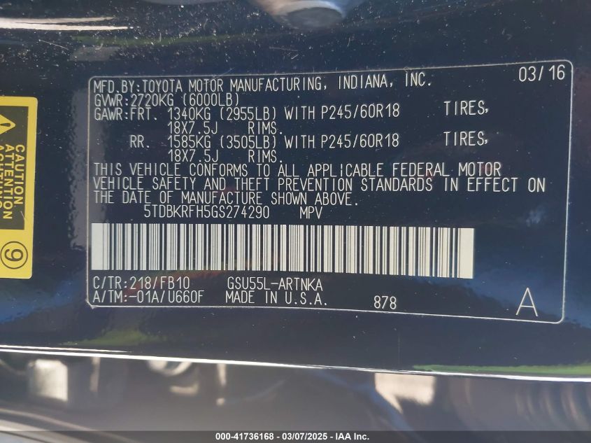 2016 TOYOTA HIGHLANDER 2016 Gasoline, 3.5, Full drive, VIN - 5TDBKRFH5GS****** from the USA
