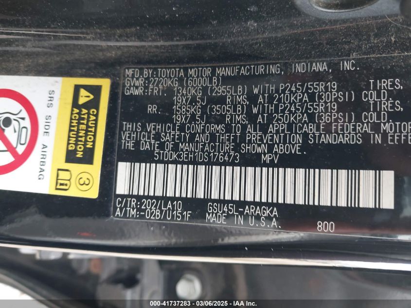 Color BlackCylinders 6Drive Full driveVIN 5TDDK3EH1DS******State Run & Drive VerifiedDamage Left sideAuction date 2025-03-21 AutoRIA