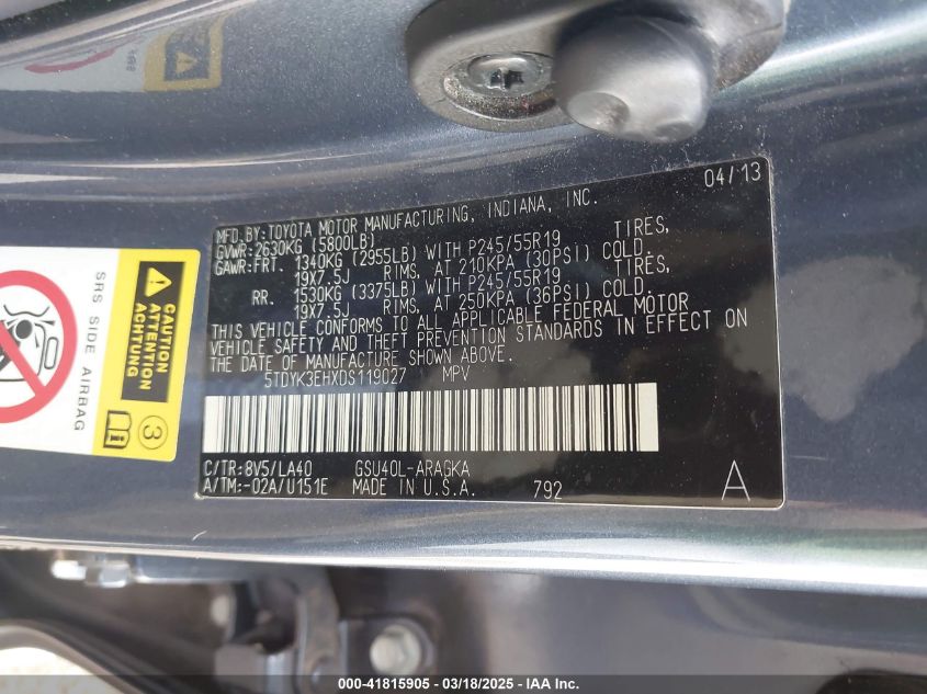 Color BlueCylinders 6Drive Front wheel driveVIN 5TDYK3EHXDS******State Run & Drive VerifiedDamage Front or back AutoRIA