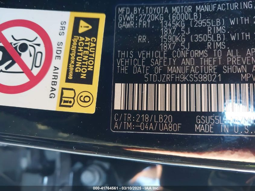 2019 TOYOTA HIGHLANDER 2019 Gasoline, 3.5, Full drive, VIN - 5TDJZRFH9KS****** from the USA