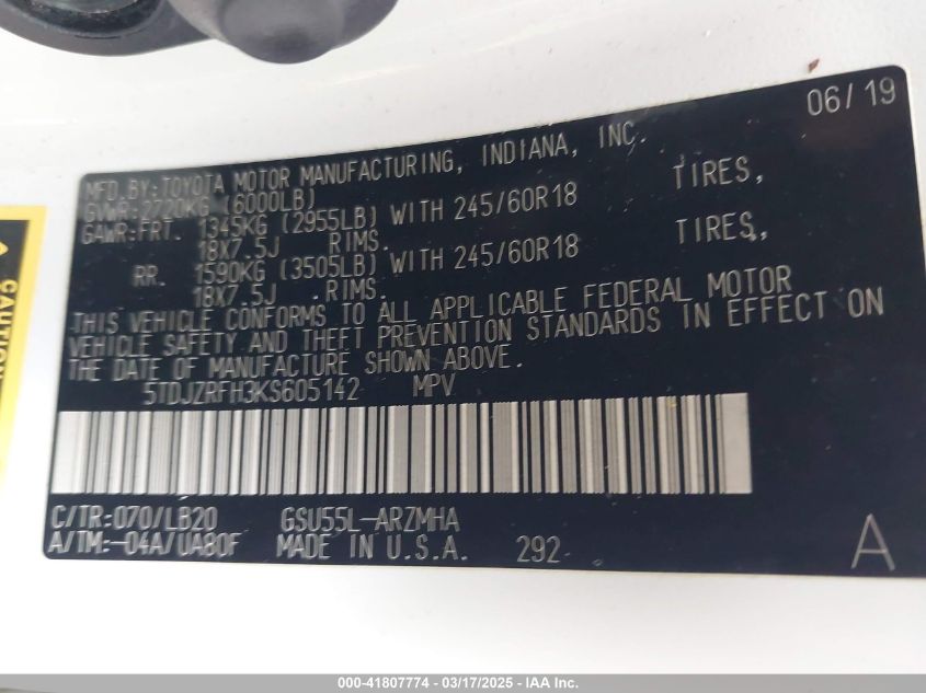 2019 TOYOTA HIGHLANDER 2019 Gasoline, 3.5, Full drive, VIN - 5TDJZRFH3KS****** from the USA