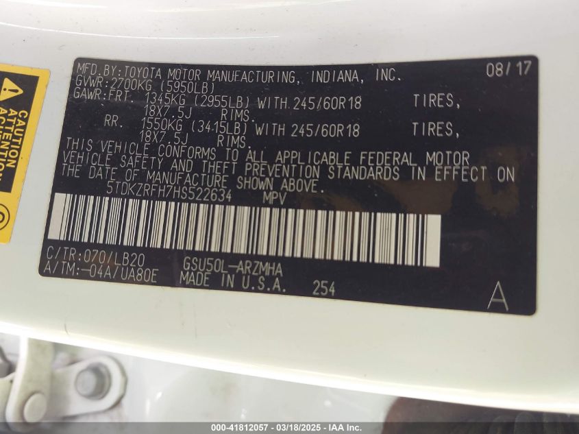 2017 TOYOTA HIGHLANDER 2017 Gasoline, 3.5, Front wheel drive, VIN - 5TDKZRFH7HS****** from the USA