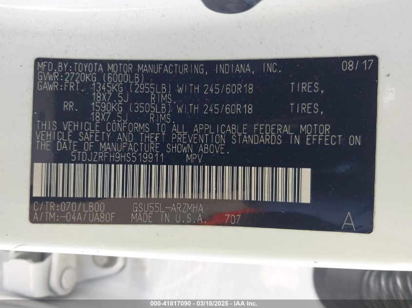 2017 TOYOTA HIGHLANDER 2017 Gasoline, 3.5, Full drive, VIN - 5TDJZRFH9HS****** from the USA