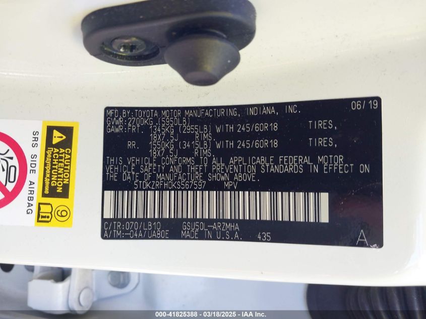 2019 TOYOTA HIGHLANDER 2019 Gasoline, 3.5, Front wheel drive, VIN - 5TDKZRFH0KS****** from the USA