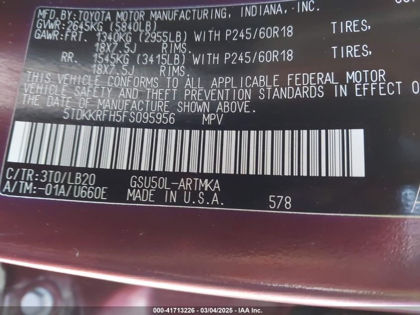 Color BurgundyCylinders 6Drive Front wheel driveVIN 5TDKKRFH5FS******State Run & Drive VerifiedDamage Front or backAuction date 2025-03-20 AutoRIA