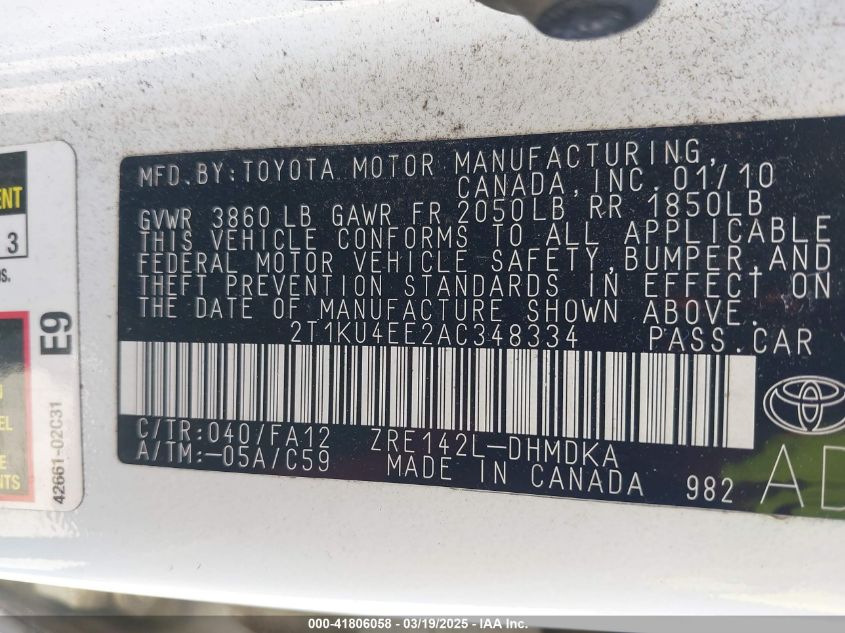 Color WhiteCylinders 4Drive Front wheel driveVIN 2T1KU4EE2AC******State Run & Drive VerifiedDamage InsignificantAuction date 2025-03-25 AutoRIA