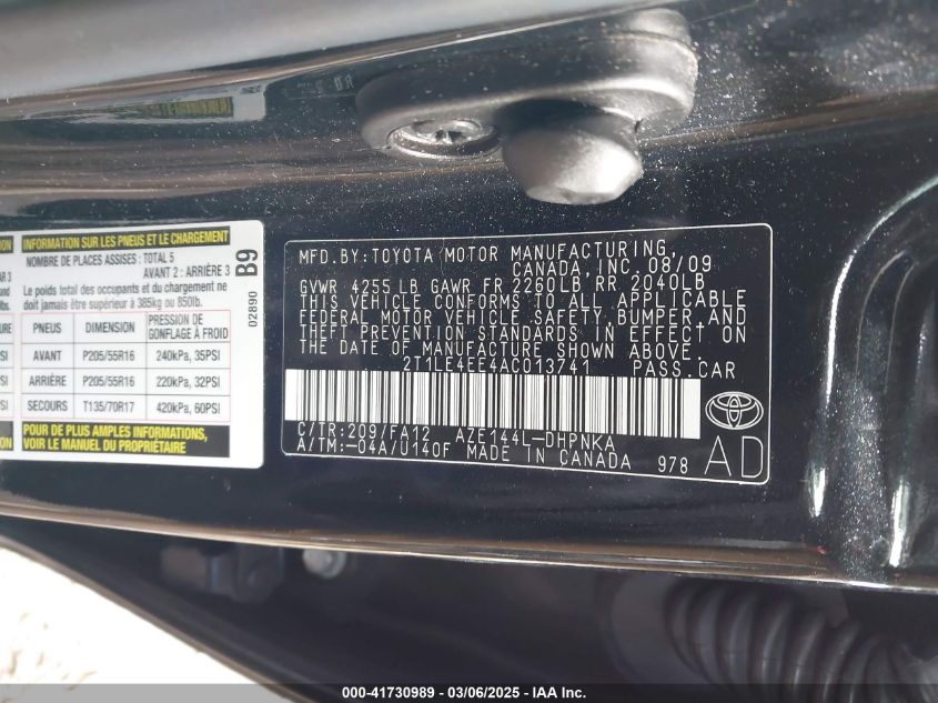 Color BlackCylinders 4Drive Full driveVIN 2T1LE4EE4AC******State Run & Drive VerifiedDamage Front rightAuction date 2025-03-20 AutoRIA