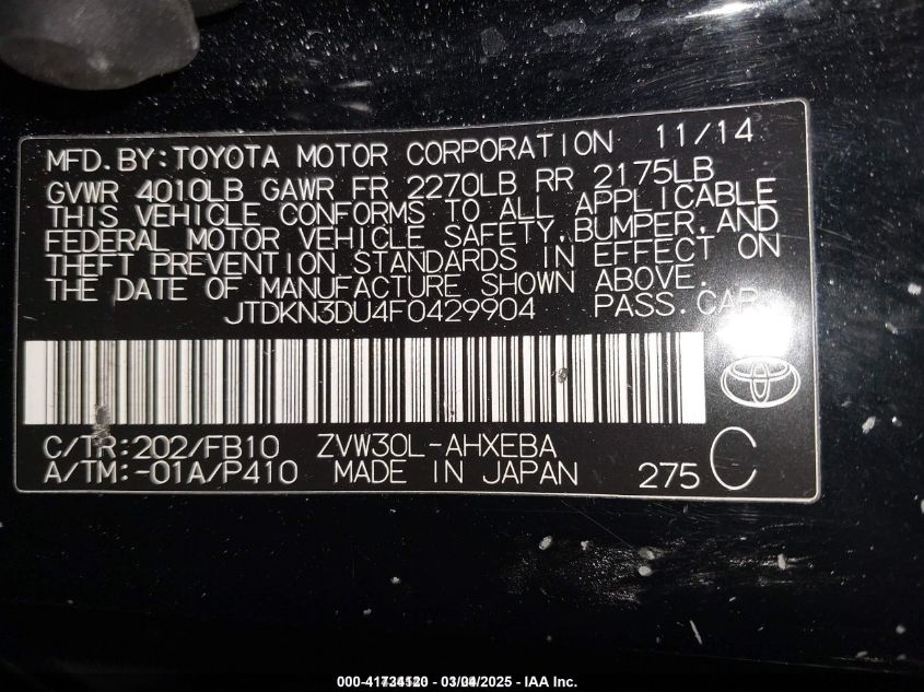 Color BlackCylinders 4Drive Front wheel driveVIN JTDKN3DU4F0******State Run & Drive VerifiedDamage Right side AutoRIA