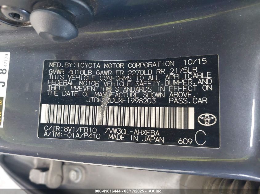 2015 TOYOTA PRIUS 2015 Hybrid, 1.8, Front wheel drive, VIN - JTDKN3DUXF1****** from the USA