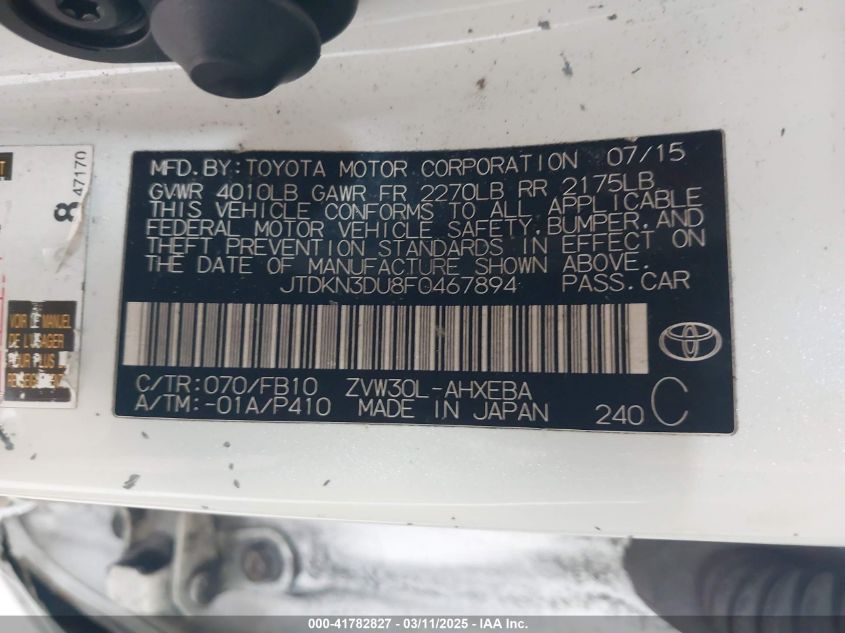 2015 TOYOTA PRIUS 2015 Hybrid, 1.8, Front wheel drive, VIN - JTDKN3DU8F0****** from the USA