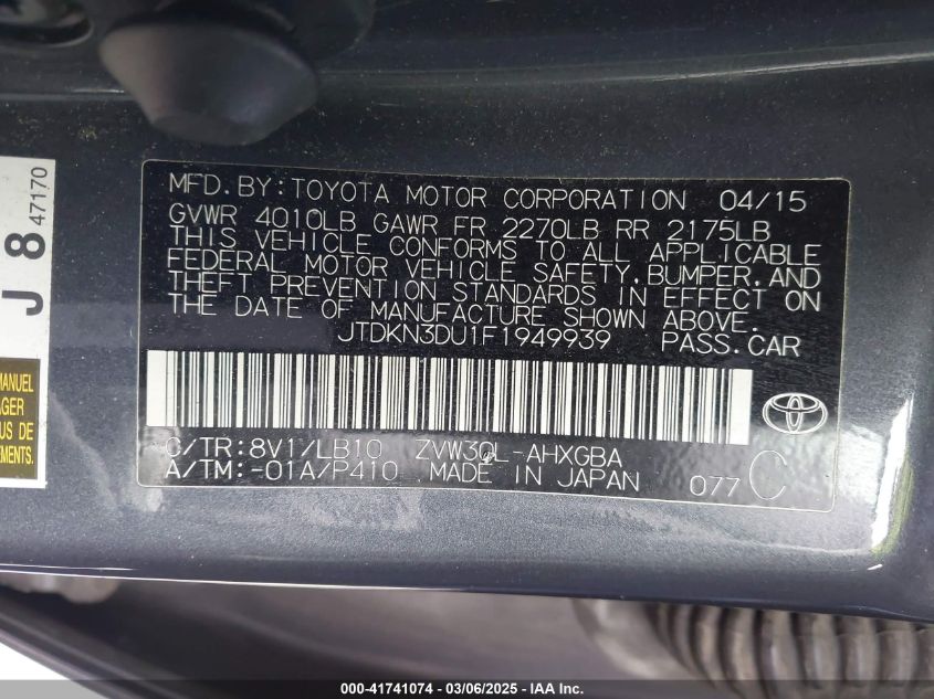 2015 TOYOTA PRIUS 2015 Hybrid, 1.8, Front wheel drive, VIN - JTDKN3DU1F1****** from the USA