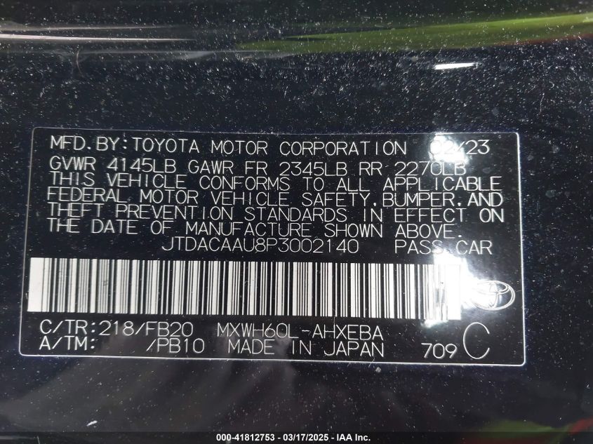 2023 TOYOTA PRIUS 2023 Hybrid, 2.0, Front wheel drive, VIN - JTDACAAU8P3****** from the USA