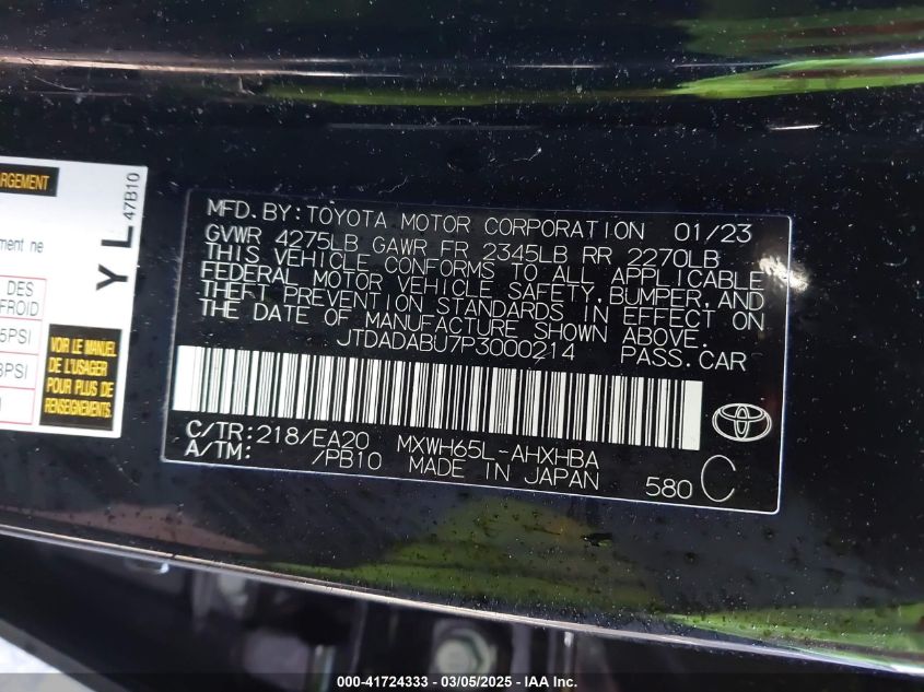 2023 TOYOTA PRIUS 2023 Hybrid, 2.0, Full drive, VIN - JTDADABU7P3****** from the USA