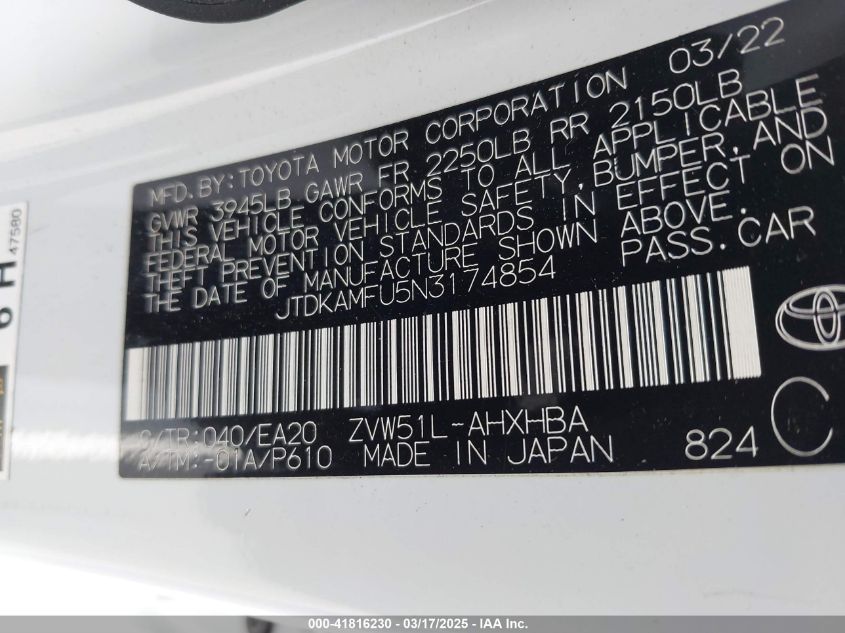 2022 TOYOTA PRIUS 2022 Hybrid, 1.8, Front wheel drive, VIN - JTDKAMFU5N3****** from the USA
