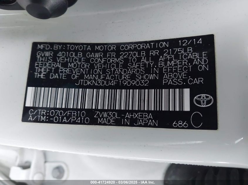 2015 TOYOTA PRIUS 2015 Hybrid, 1.8, Front wheel drive, VIN - JTDKN3DU4F1****** from the USA