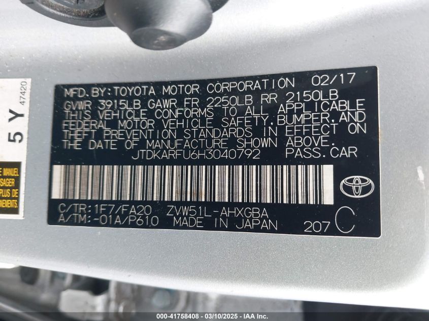 2017 TOYOTA PRIUS 2017 Hybrid, 1.8, Front wheel drive, VIN - JTDKARFU6H3****** from the USA