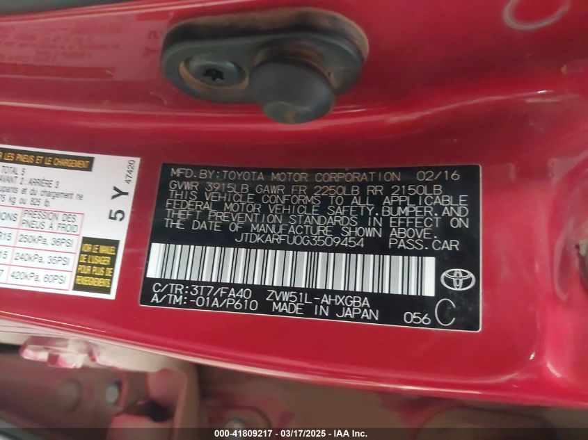 Color RedCylinders 4Drive Front wheel driveVIN JTDKARFU0G3******State Run & Drive VerifiedDamage Front or back AutoRIA