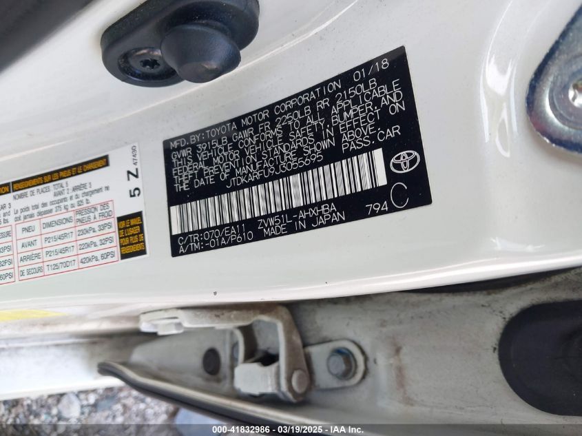2018 TOYOTA PRIUS 2018 Hybrid, 1.8, Front wheel drive, VIN - JTDKARFU9J3****** from the USA