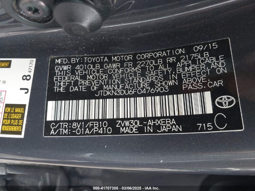 2015 TOYOTA PRIUS 2015 Hybrid, 1.8, Front wheel drive, VIN - JTDKN3DU6F0****** from the USA