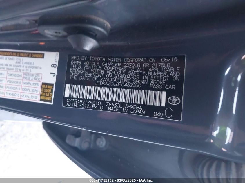 2015 TOYOTA PRIUS 2015 Hybrid, 1.8, Front wheel drive, VIN - JTDKN3DU8F0****** from the USA
