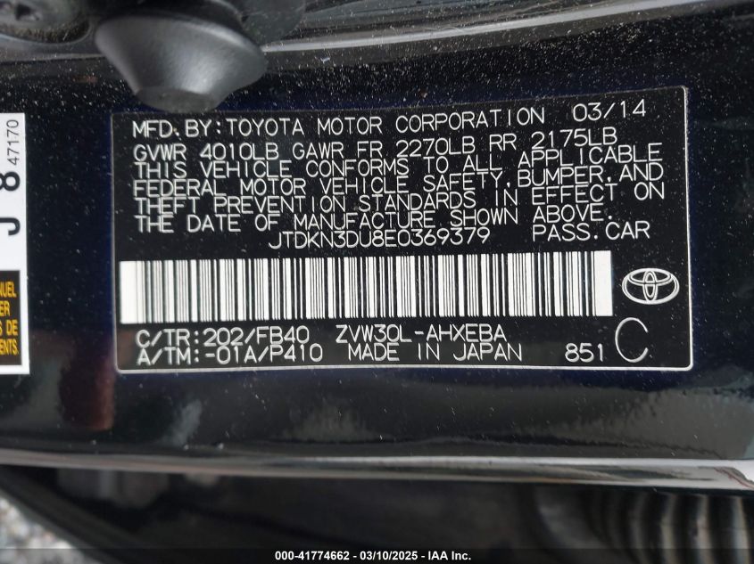 Color BlackCylinders 4Drive Front wheel driveVIN JTDKN3DU8E0******State Run & Drive VerifiedDamage BackAuction date 2025-03-21 AutoRIA