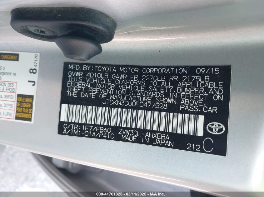 Color SilverCylinders 4Drive Front wheel driveVIN JTDKN3DU0F0******State Run & Drive VerifiedDamage Front or back AutoRIA