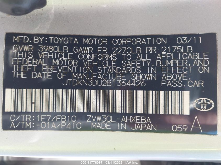 Color SilverCylinders 4Drive Front wheel driveVIN JTDKN3DU2B1******State Run & Drive VerifiedDamage Right sideAuction date 2025-03-20 AutoRIA