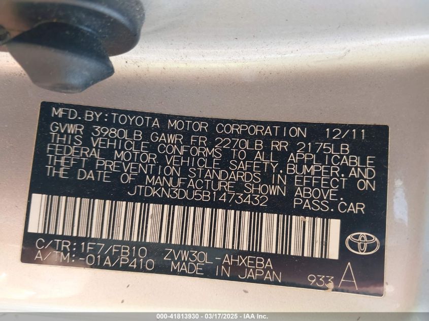 Color SilverCylinders 4Drive Front wheel driveVIN JTDKN3DU5B1******State Run & Drive VerifiedDamage Left side AutoRIA