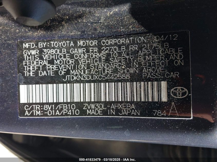 Color GrayCylinders 4Drive Front wheel driveVIN JTDKN3DUXC5******State Run & Drive VerifiedDamage InsignificantAuction date 2025-03-24 AutoRIA