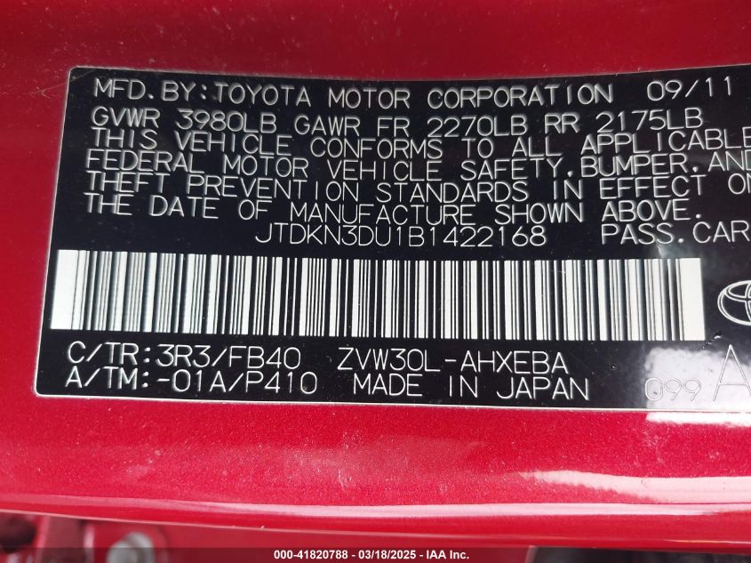 Color RedCylinders 4Drive Front wheel driveVIN JTDKN3DU1B1******State Run & Drive VerifiedDamage Front right AutoRIA