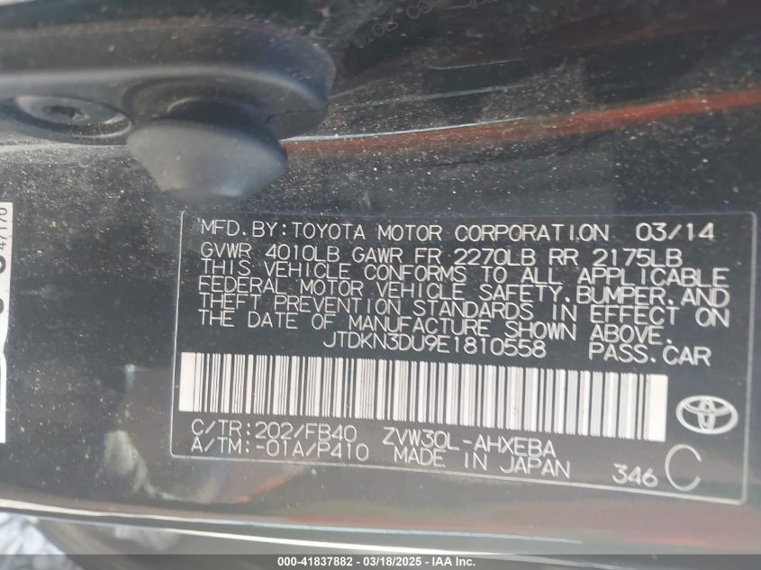 Color BlackCylinders 4Drive Front wheel driveVIN JTDKN3DU9E1******State Run & Drive VerifiedDamage Front left AutoRIA
