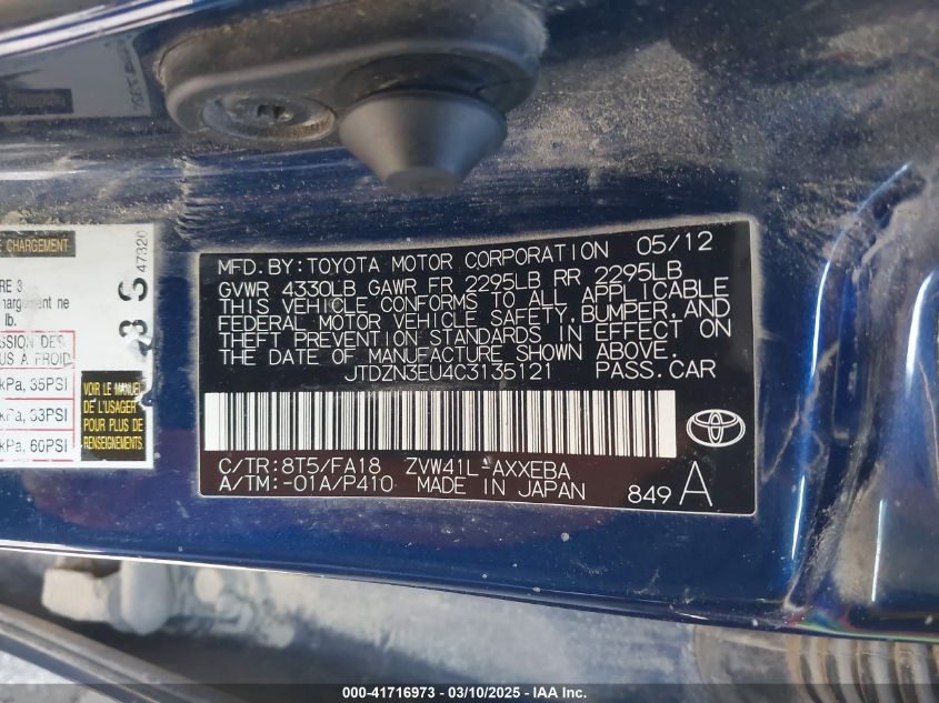 Color BlueCylinders 4Drive Front wheel driveVIN JTDZN3EU4C3******State Run & Drive VerifiedDamage Front or backAuction date 2025-03-26 AutoRIA