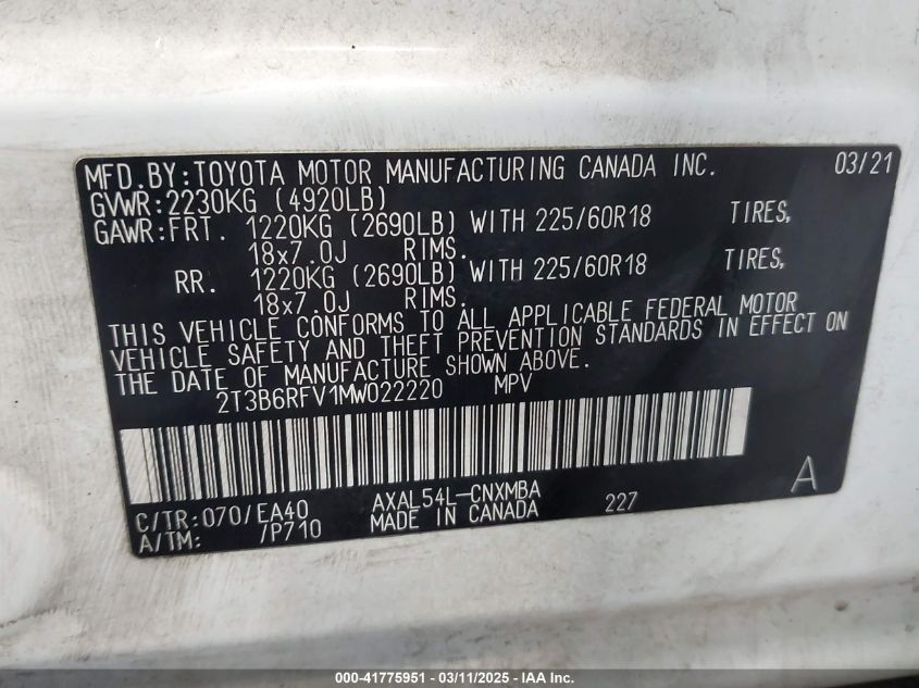 2021 TOYOTA RAV4 HYBRID 2021 Hybrid, 2.5, Full drive, VIN - 2T3B6RFV1MW****** from the USA