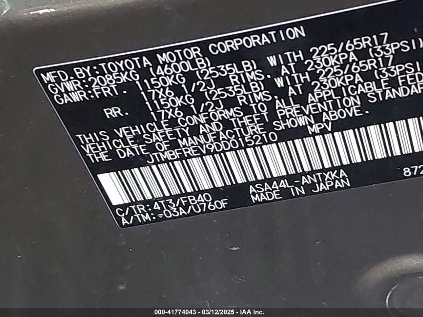 Color GrayCylinders 4Drive Full driveVIN JTMBFREV9DD******State Run & Drive VerifiedDamage Rear rightAuction date 2025-03-26 AutoRIA