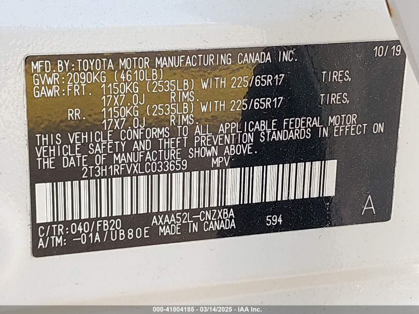 2020 TOYOTA RAV4 2020 Gasoline, 2.5, Front wheel drive, VIN - 2T3H1RFVXLC****** from the USA