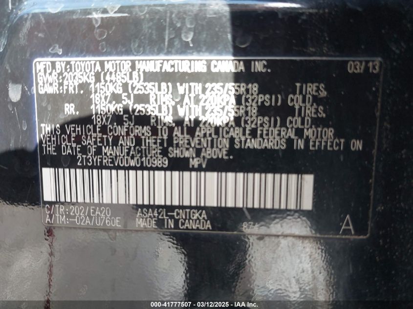 Color BlackCylinders 4Drive Front wheel driveVIN 2T3YFREV0DW******State Run & Drive VerifiedDamage Front or backAuction date 2025-04-01 AutoRIA
