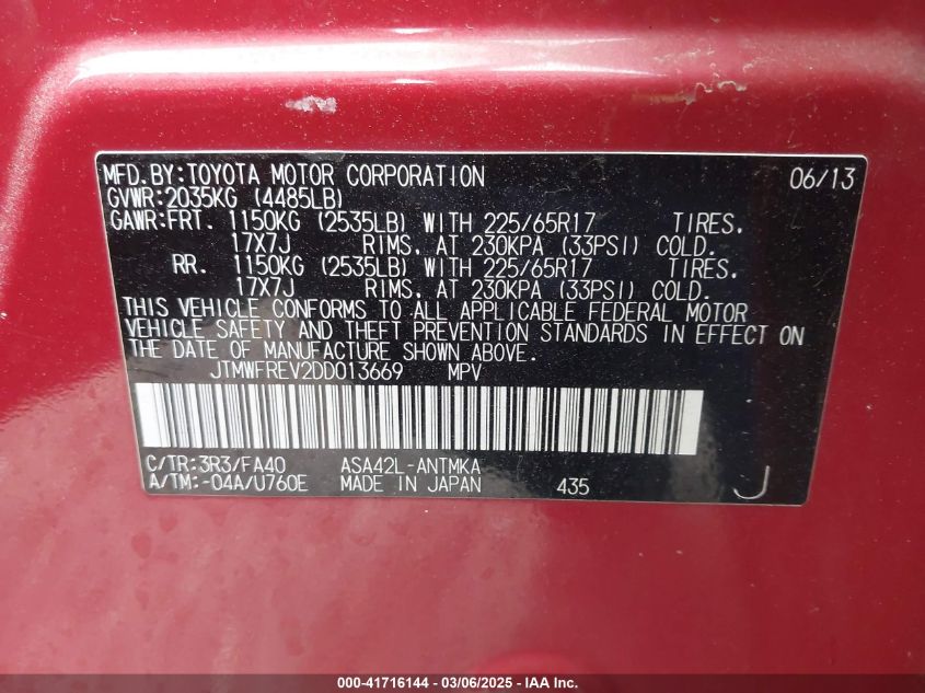Color RedCylinders 4Drive Front wheel driveVIN JTMWFREV2DD******State Run & Drive VerifiedDamage All over the car AutoRIA
