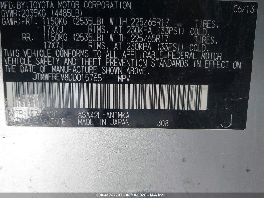 Color SilverCylinders 4Drive Front wheel driveVIN JTMWFREV8DD******State Run & Drive VerifiedDamage BackAuction date 2025-03-27 AutoRIA