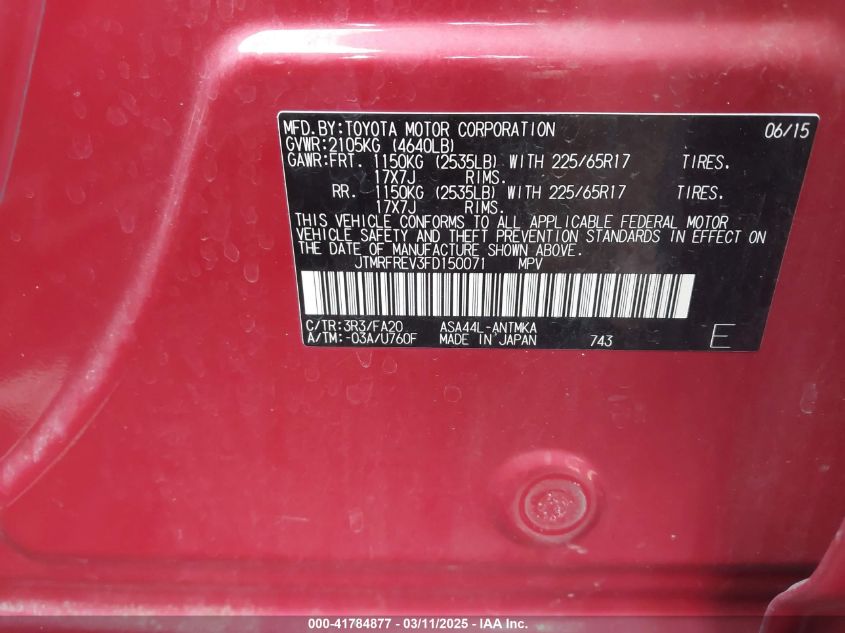 Color RedCylinders 4Drive Full driveVIN JTMRFREV3FD******State Run & Drive VerifiedDamage InsignificantAuction date 2025-03-20 AutoRIA